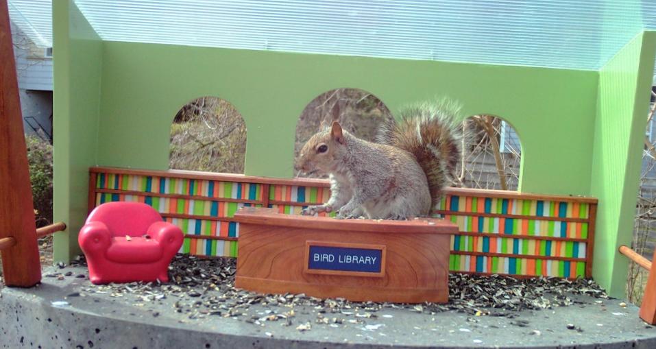 “Oh, um, hi. I am a bird. I flew here to check out some books. I love eating…I mean, reading.”