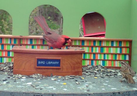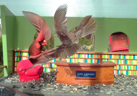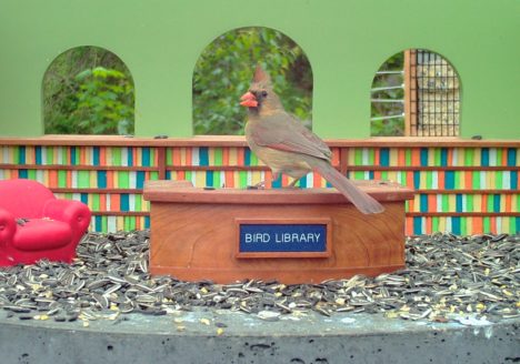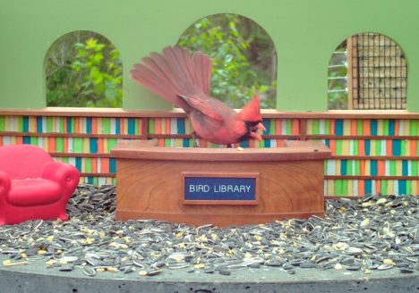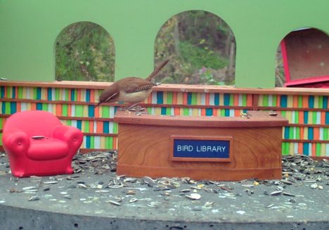 You may have heard that books are the most dangerous thing in the library, but Carolina Wren thinks it’s this red chair. It’s armed, after all.