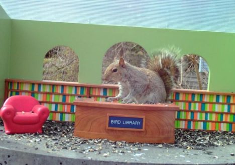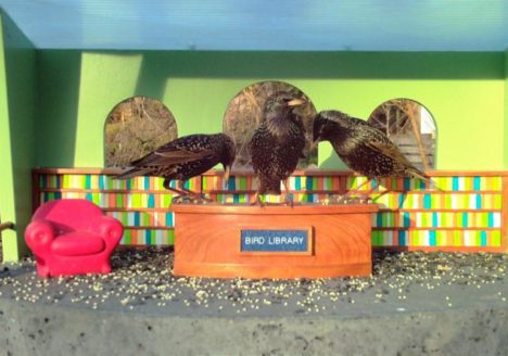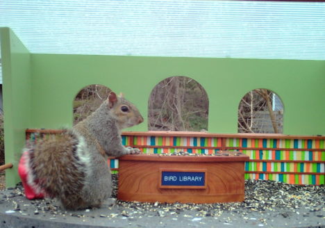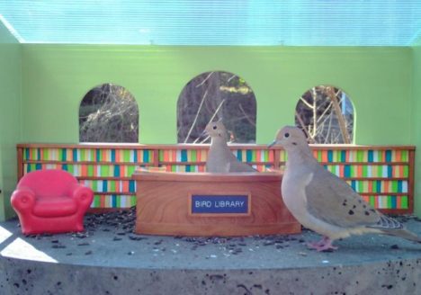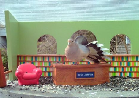 “Oh, um, hi. I am a bird. I flew here to check out some books. I love eating…I mean, reading.”