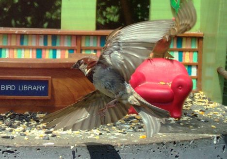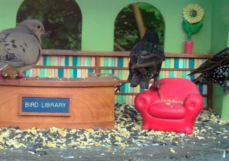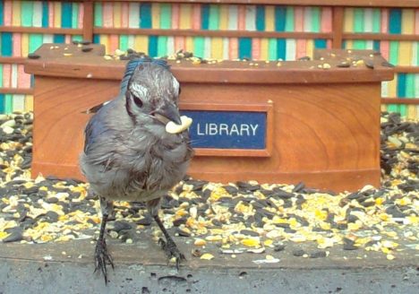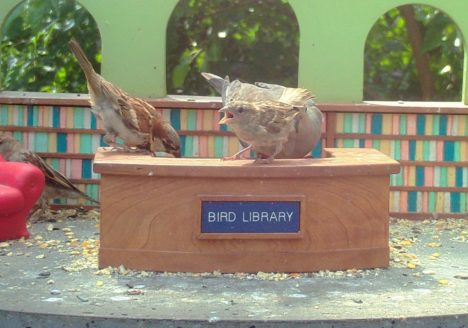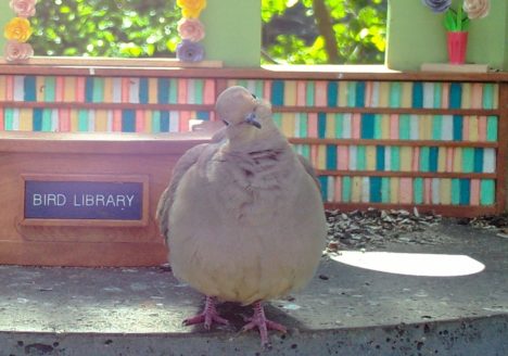 “We three doves from library are, eating seeds from our own snack bar.”