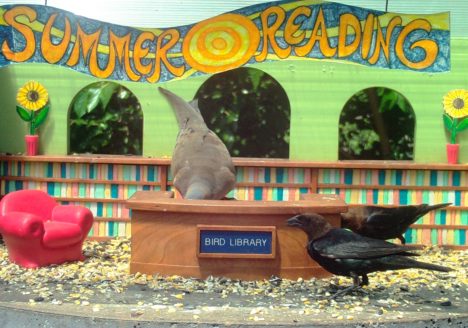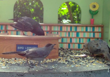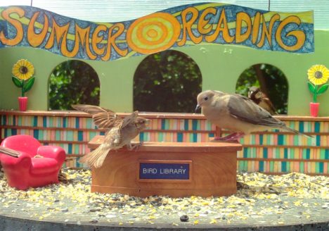 “We three doves from library are, eating seeds from our own snack bar.”